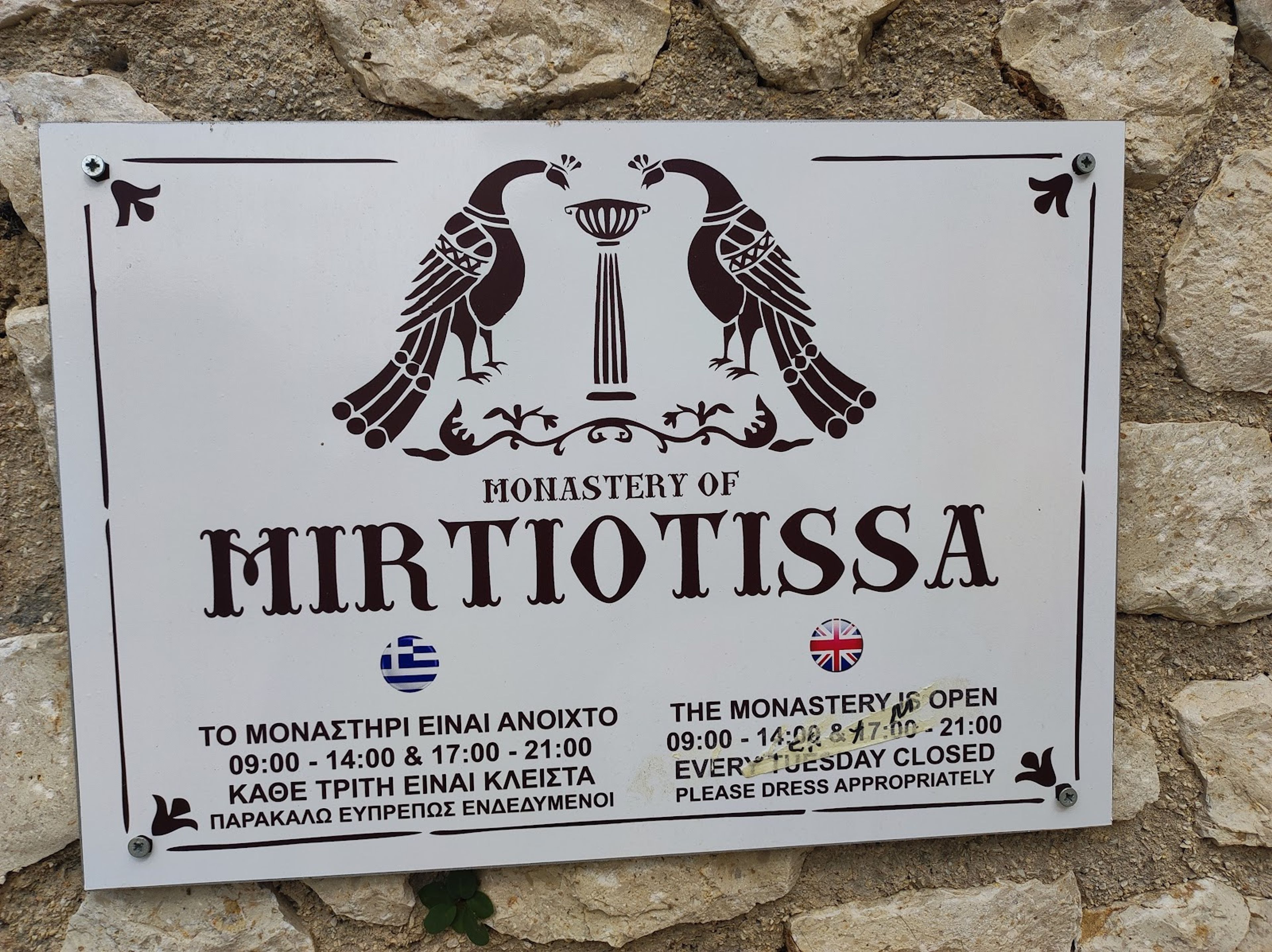 The monastery receives its name from the miraculous icon of the Virgin Mary discovered among myrtle bushes in the 14th century on Kythera, Greece.