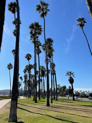 East Beach extends along a palm-lined coast with volleyball courts, a playground, and pathways connecting to Stearns Wharf and Santa Barbara Zoo.