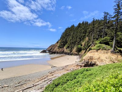 Indian Beach stretches along the Pacific coastline with sandy areas and rocky formations, offering tide pools filled with marine creatures and starfish.