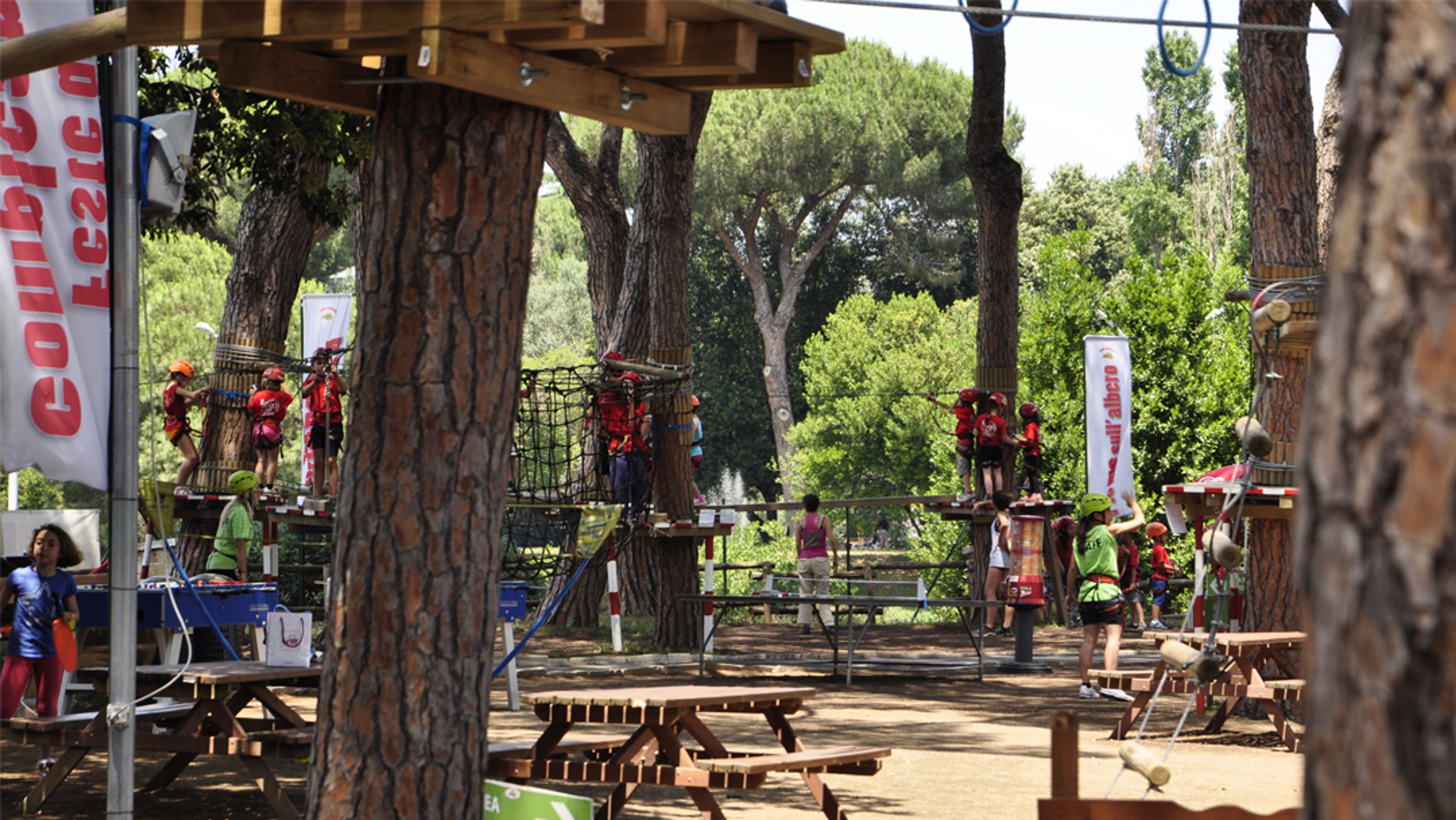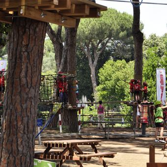 EurPark Adventure features seven elevated rope courses and a four-sided climbing tower within a century-old pine forest in Rome.