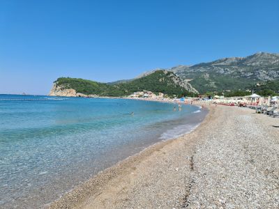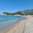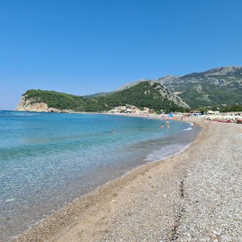 The 2250-meter Buljarica Beach features a combination of pebbles and soft sand along the Adriatic Sea, bordered by Mediterranean grasslands and forests.
