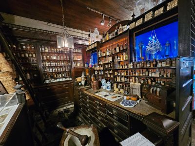 The two-story building contains numerous exhibits featuring historical pharmaceutical devices, medical instruments, and antique apothecary bottles from the 19th century.