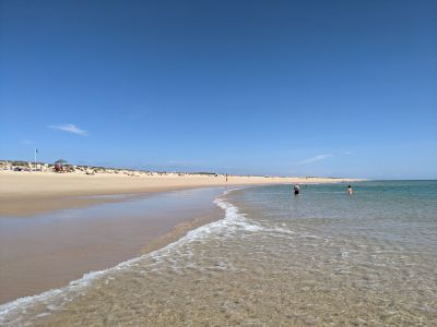 The beach extends over 2 kilometers along the southern edge of Culatra Island, featuring white sand and clear Mediterranean waters.