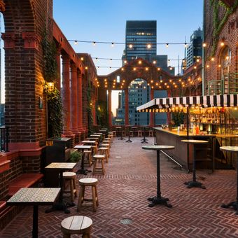 This 17-story brick building features a Renaissance Revival design with terracotta decorations, a granite base, and a distinctive rooftop garden topped by a central tower.