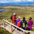 The wooden boardwalk structure protects the delicate blanket bog ecosystem while providing access to panoramic views of the Marble Arch Caves Global Geopark.