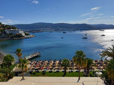 The beach sits near ancient Halicarnassus, where the remains of one of the Seven Wonders of the Ancient World, the Mausoleum, stood in the 4th century BC.