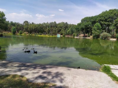The 28-hectare green space contains walking paths, sports facilities, playgrounds, and a central lake resembling the ancient Lake Texcoco.