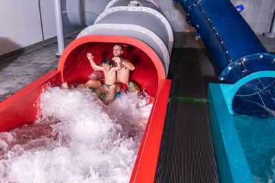Visitors can experience the Virtual Reality water slide, which combines physical sliding with digital projections across three themes: jungle, space, and snow environments.