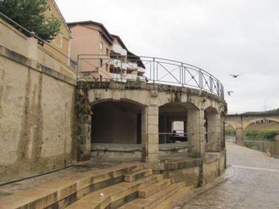 The structure features a distinctive architectural design with ten arcade sections that extend over the water, following the curve of the riverbank.