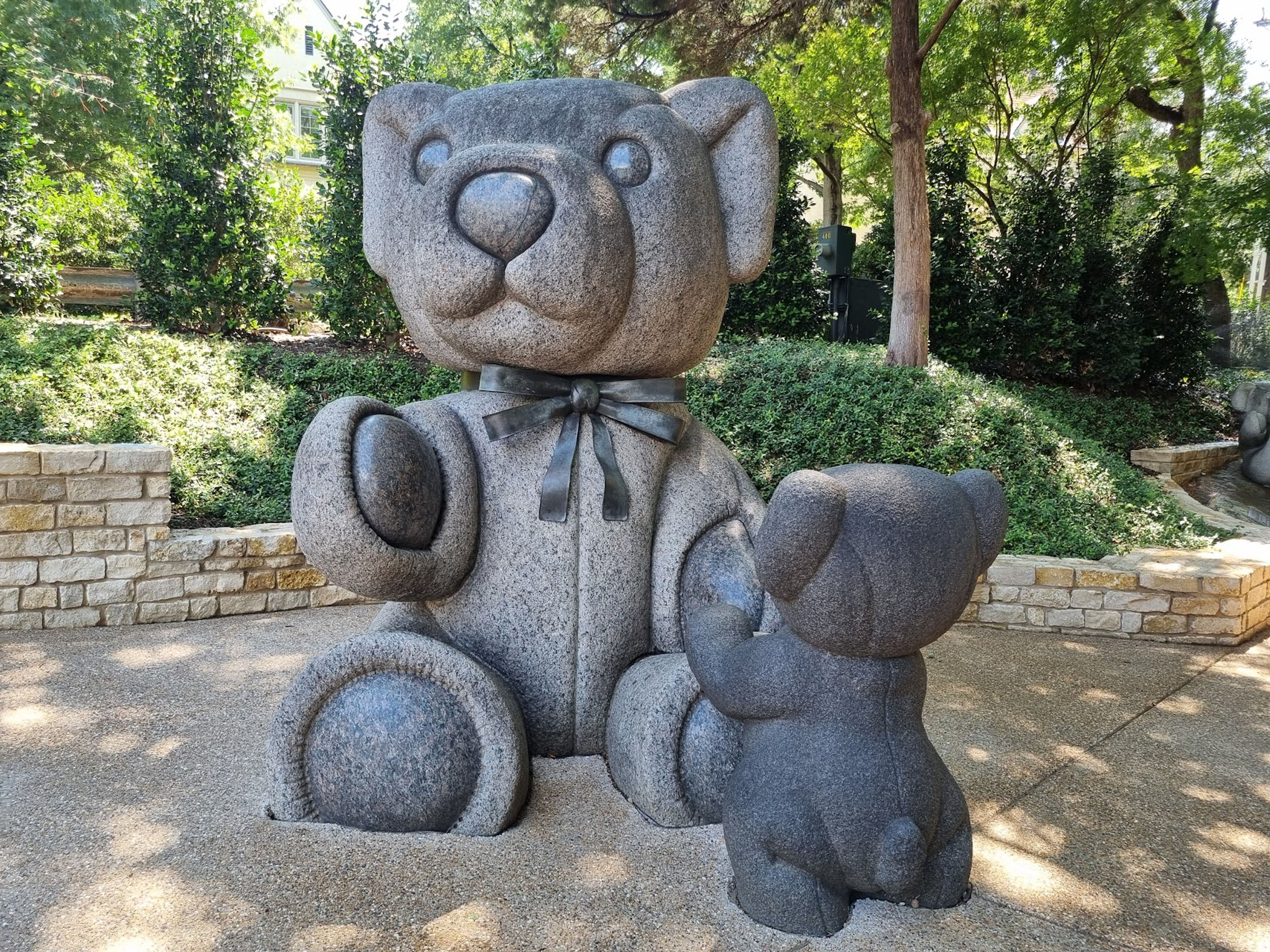 The main teddy bear statue weighs approximately 20 tons, making it one of the largest granite bear sculptures in the Dallas metropolitan area.