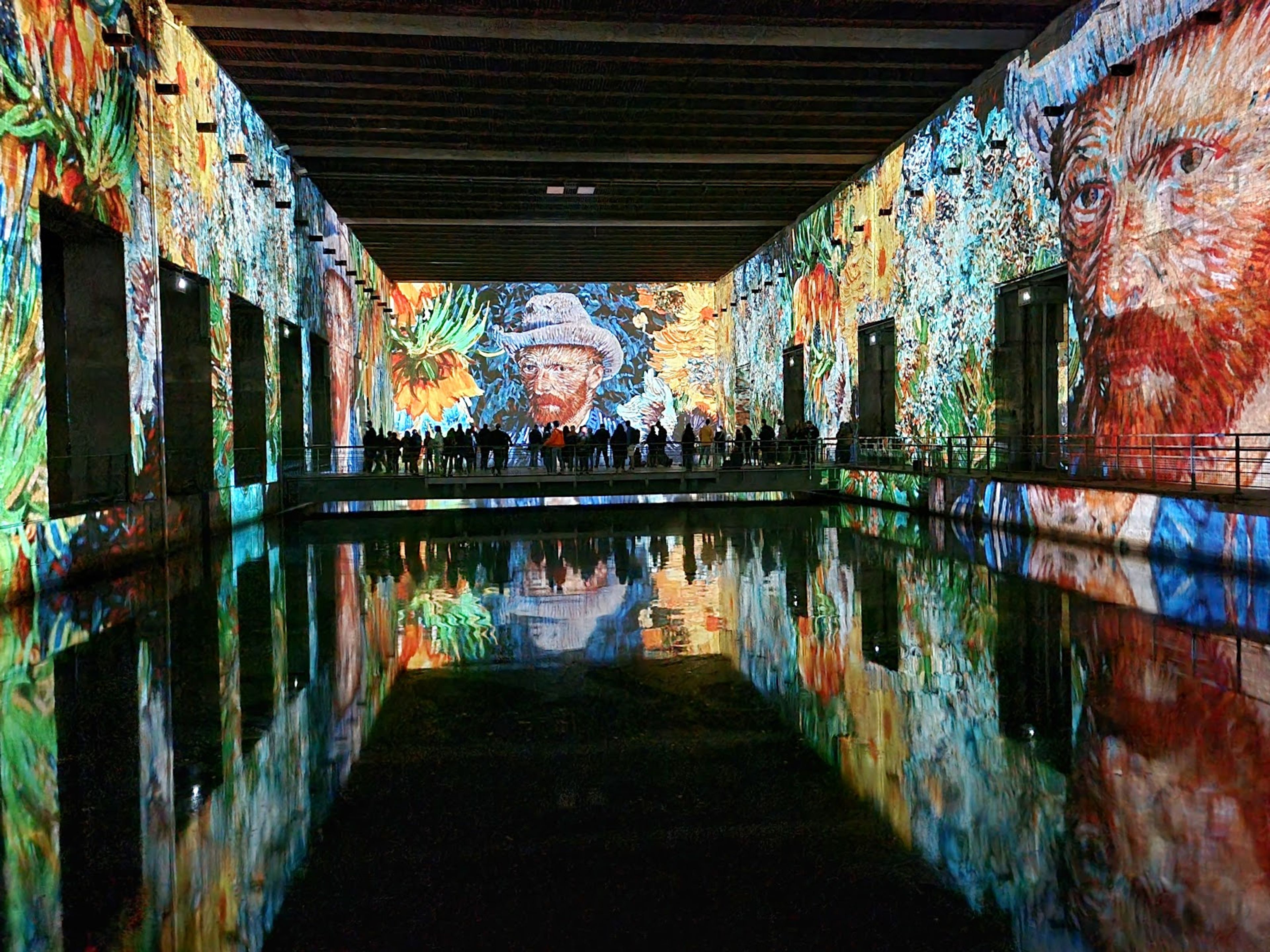 The Bassins de Lumières occupies four submarine base chambers, featuring monumental digital exhibitions across 12,000 square meters of projection surfaces with 90 video projectors.