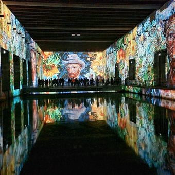 The exhibitions combine classical art masterpieces with digital technology, displaying works from renowned painters through immersive projections on concrete walls and water surfaces.