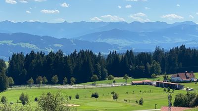 The 9-hole golf course stretches across green meadows with natural elevations and water hazards, positioned between Lake Constance and the Allgäu mountains.