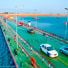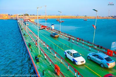 The Al Nasr Al Aa'em Bridge spans across water with a movable design that allows vessels to pass through its sections when required.