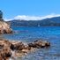 Mediterranean vegetation surrounds the beach, while its gradually descending sandy seabed creates shallow turquoise waters perfect for swimming.