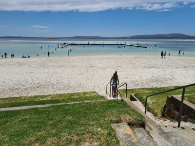 The 400-meter beach stretches along Oyster Harbour with white sand shores and shallow tidal flats leading to seagrass meadows.