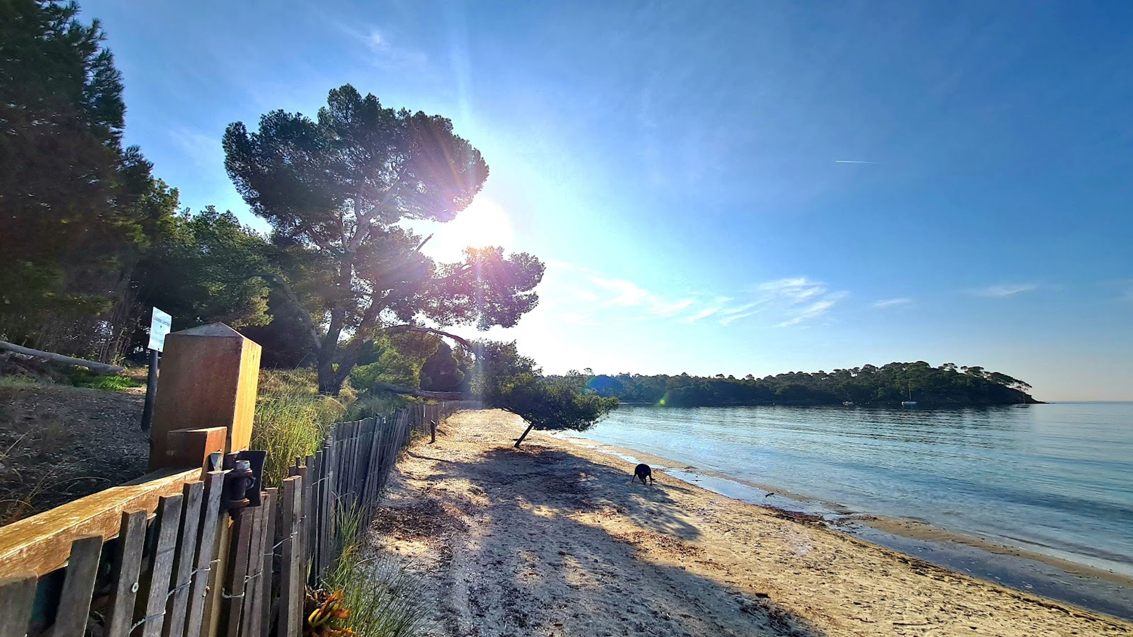 Behind the Léoube islet, the beach provides views of a former underwater missile testing platform, marking its connection to maritime research.