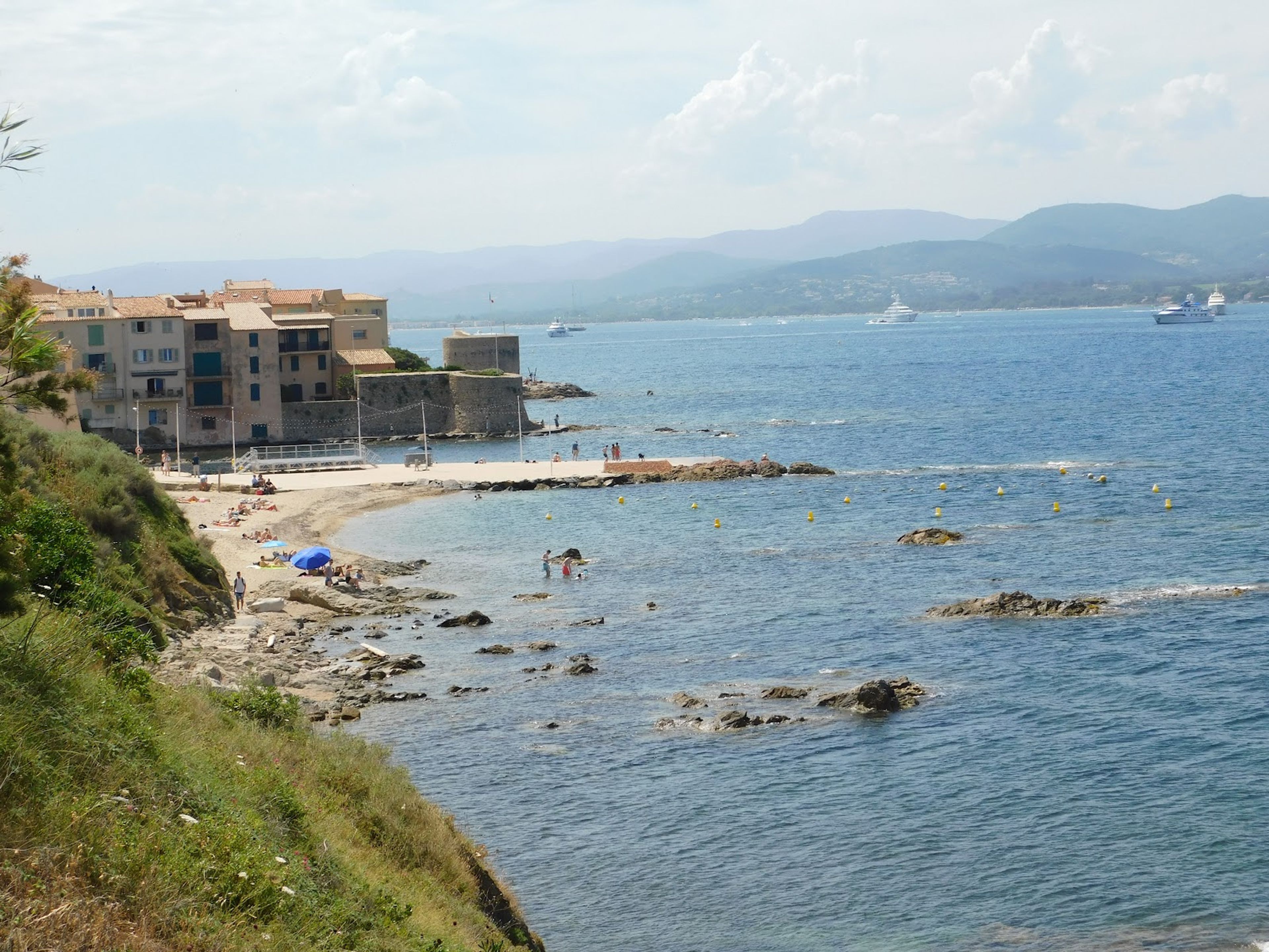 The sandy and pebbly beach stretches along the eastern part of Saint-Tropez Bay, providing direct views of boats sailing across the Mediterranean Sea.