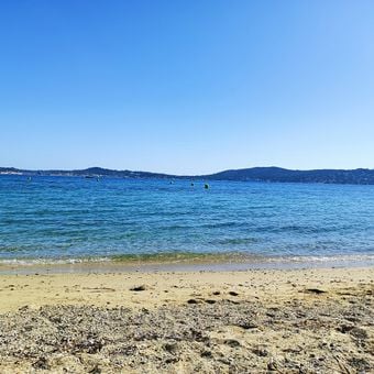The beach combines sand and pebbles along a shoreline facing Saint-Tropez, with a dense pine forest providing natural shade to visitors.