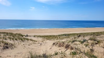 The wooden walkway leads visitors through pine forests to an extended stretch of golden sand meeting the Atlantic Ocean waters.