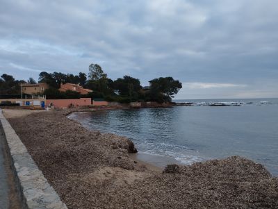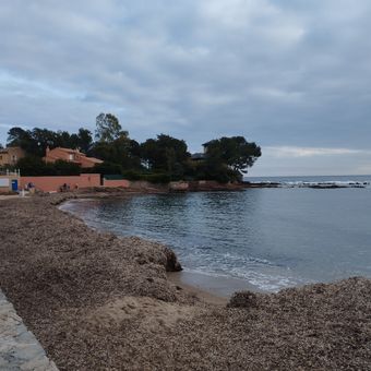 The 100-meter-long sandy beach stretches along the coastal road between La Corniche and Agay, offering views of the Mediterranean Sea.