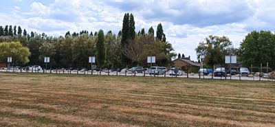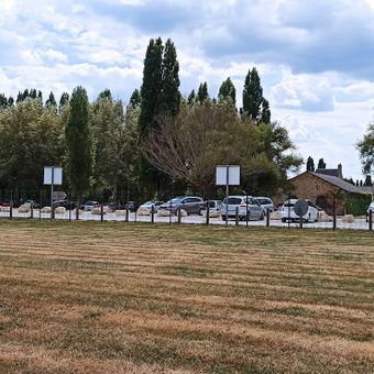 The course integrates with a larger recreational complex that includes a sandy beach, pedal boats, and windsurfing facilities on the adjacent lake.