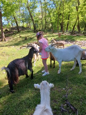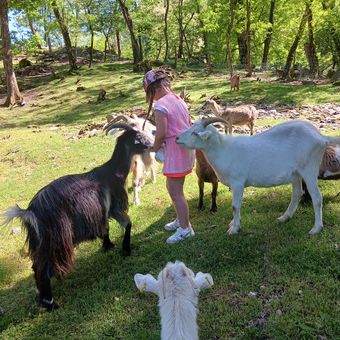 The facility features numerous farm animals including goats, sheep, rabbits, and chickens, allowing visitors to interact with and learn about domestic animals.