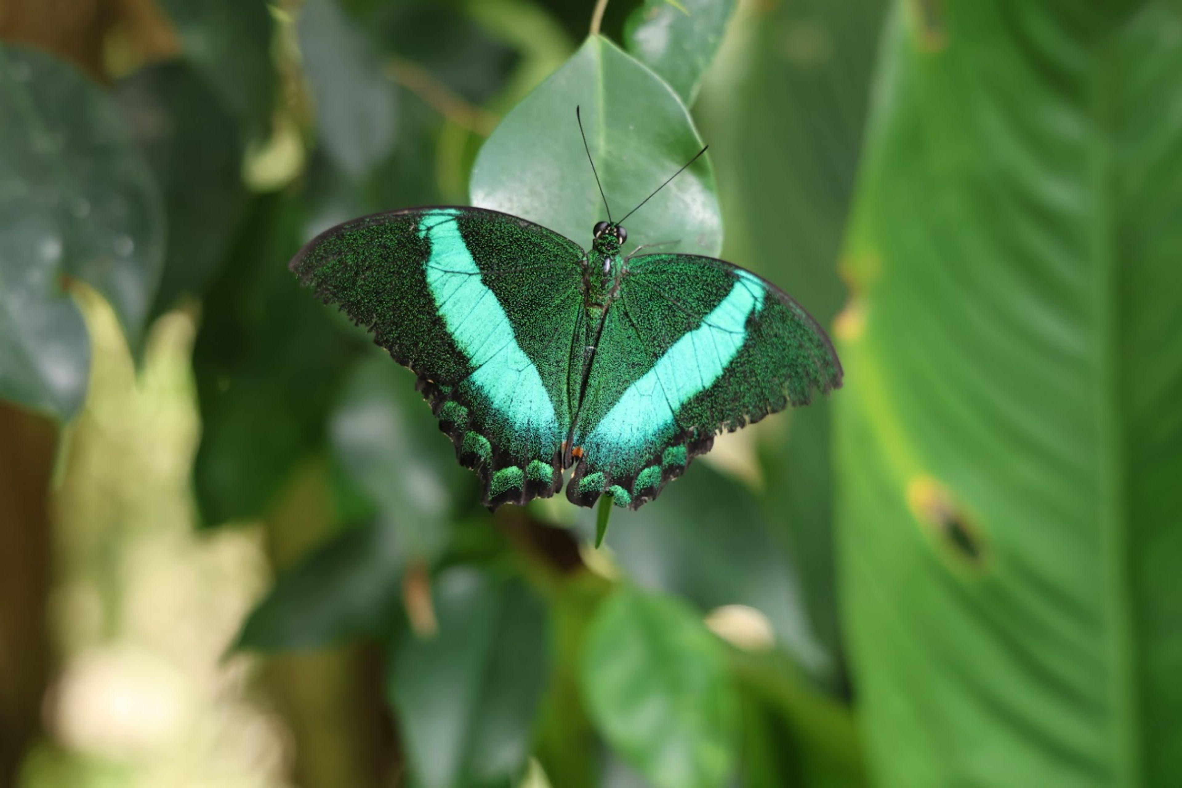Visitors walk through narrow paths in a temperature-controlled environment where Atlas butterflies and Blue Morphos float freely around tropical vegetation.