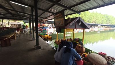 Lembang Floating Market is a theme park and marketplace in Bandung Barat, Indonesia, set across a landscaped lake. Wooden boats are moored to a central dock network where vendors sell their goods.