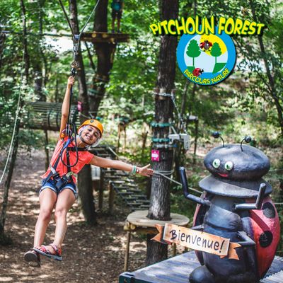 Pitchoun Forest contains five different tree-top courses of increasing difficulty levels, featuring safety equipment and specialized climbing structures for children.