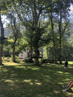La Forêt Suspendue integrates natural elements with suspended walkways and climbing routes across different levels among trees in the Pyrénées mountains.