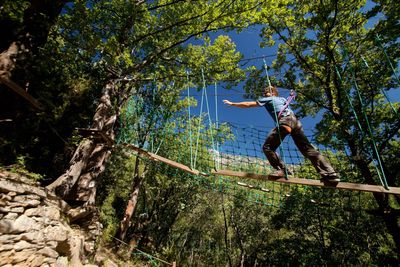 Children starting from age three can access specialized courses with safety harnesses, while advanced paths rise six meters above ground with slackline features.