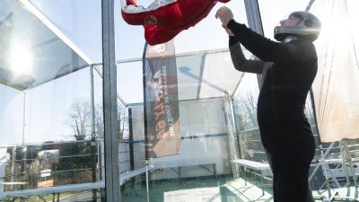 AirFly64 features a vertical wind tunnel that generates air speeds up to 180 kilometers per hour to simulate free-fall conditions indoors.