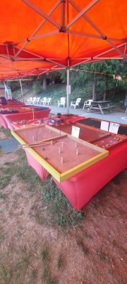 Ludifête combines indoor reception tents and outdoor play areas with giant inflatable structures and traditional wooden games across its expansive grounds.