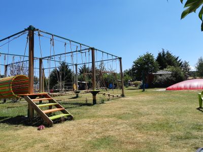 The Neyrial Leisure Centre extends across a landscaped park with multiple recreational zones, including trampolines, inflatable structures, and pedal go-karts for children.