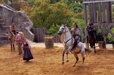 The theme park features equestrian shows, combat performances, and a wildlife zoo near the Castle of Rocamadour in the Lot region of France.