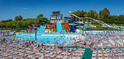 Onda Blu extends across 120,000 square meters, featuring water slides, wave pools, and a lazy river for recreational activities throughout summer days.