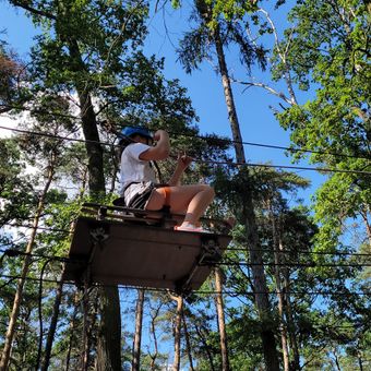 Park Linowy is an outdoor rope climbing course in Ostrów Wielkopolski with four different routes suspended between trees. The routes range from 20 to 75 feet (6 to 23 meters) high and feature over 50 obstacles ranging from simple bridges to ziplines, each designed for different skill levels.