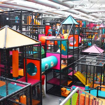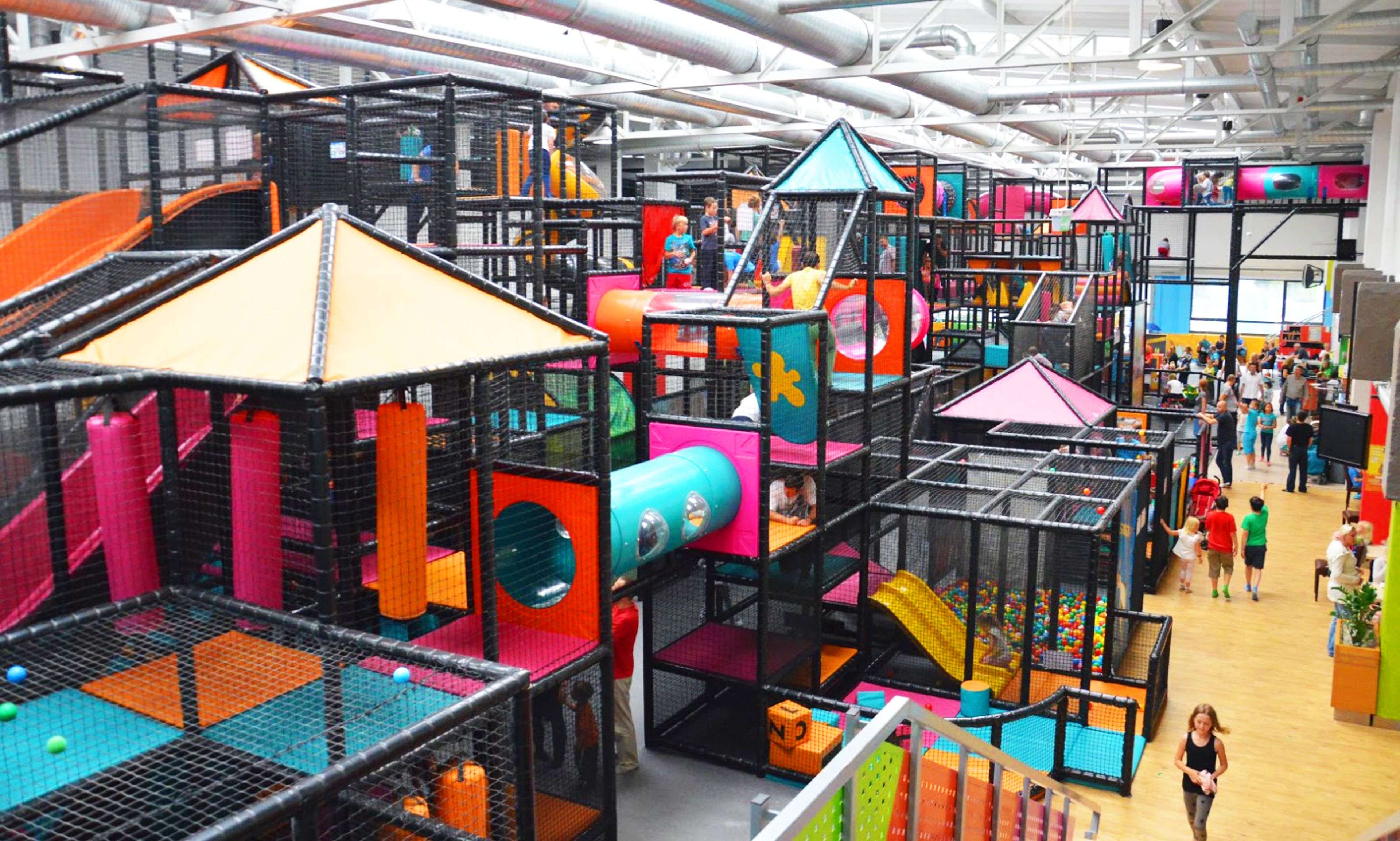 The indoor theme park spans 3000 square meters across multiple levels, featuring slides, trampolines, climbing walls, and dedicated play zones for different age groups.