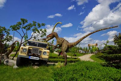 The park spans across multiple zones featuring life-sized dinosaur models, interactive displays, and educational exhibits explaining different prehistoric species and their environments.