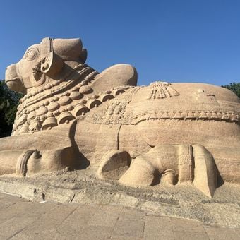 The Lepakshi Nandi is a monumental bull statue carved from a single granite block, measuring roughly 15 feet (4.5 meters) tall and 27 feet (8 meters) long. The sculpture displays intricate details including a decorated necklace, earrings, and miniature motifs, while short gently curved horns emphasize the youthful appearance of the animal.