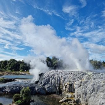 The famous Pohutu geyser erupts several times daily, shooting water high into the air with varying intensity each time. Visitors can also taste fresh corn cooked directly in the park's natural hot water pools, offering a unique culinary experience.