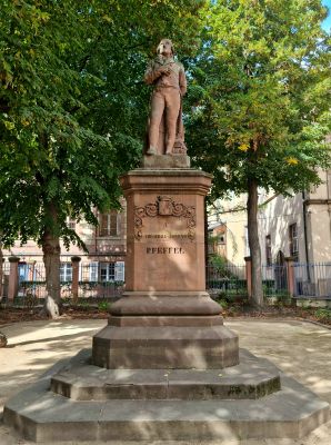 The monument features a standing figure of Theophile Conrad Pfeffel, the celebrated 18th-century writer and educator from Colmar, France.