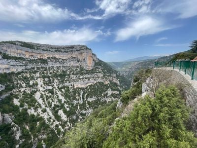 The Gorges de la Nesque spans a length of 400 meters in depth, carved through limestone formations between the villages of Villes-sur-Auzon and Monieux.