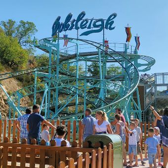 The name reflects the winter sport influence, incorporating elements that simulate the experience of competitive bobsled racing on a steel track structure.