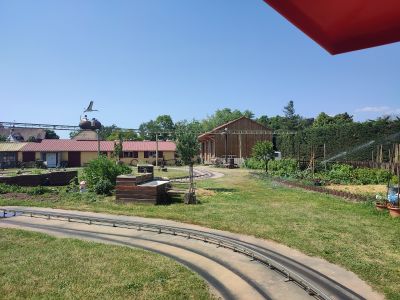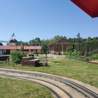 Eight electric tractors travel on a guided rail circuit through different thematic zones representing the agricultural landscapes of the Alsace region.