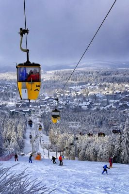 ErlebnisBocksBerg Hahnenklee features a comprehensive mountain adventure park offering cable car rides, summer toboggan runs including the 1250-meter BocksBergBob, mountain bike trails, and a new dragon-themed toboggan run called Drachenblitz spanning 560 meters with themed dragon sculptures and fast curves.