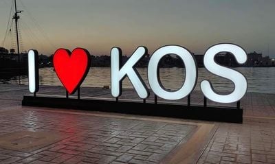 The I Love Kos sign stands tall with white letters and a heart symbol, creating a focal point near the Aegean Sea waterfront.