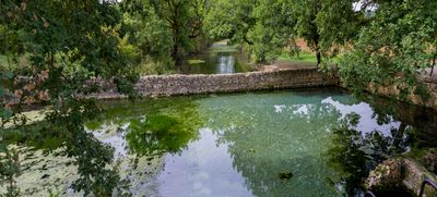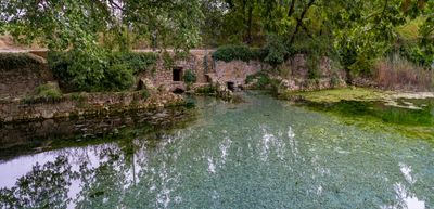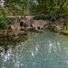 Natural stone formations contain the thermal springs, creating mirror-like water surfaces that reflect the surrounding woodland where a mill once operated.