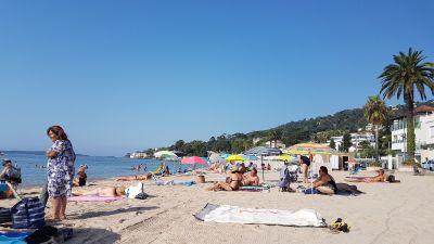 The 500-meter stretch of white sand at Plages du Soleil extends along the Mediterranean coast, offering a 10-meter wide area for beachgoers.